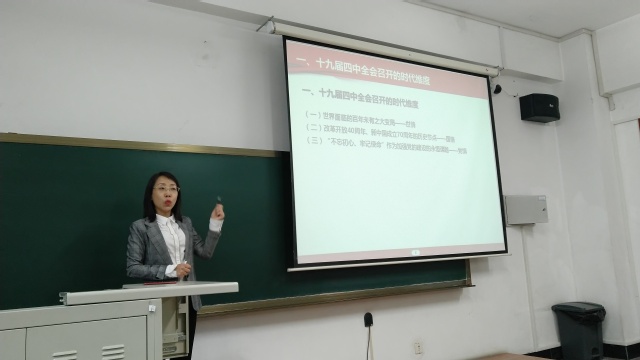 巩茹敏教授分别从十九届四中全会召开的时代维度、取得的标志成果、涵盖的主要内容、彰显的鲜明特点等四方面内容对全会精神进行了全方位解读。巩茹敏教授首先介绍了十九届四中全会召开的时代维度。她介绍说,党的十九届四中全会是在世界面临的百年未有之大变局的世情维度之下召开的,是在改革开放40周年、新中国成立70周年的历史节点的国情维度之下召开的,是在党将“不忘初心、牢记使命”主题教育作为加强党的建设的永恒课题的党情维度之下召开的,意义非同一般。
