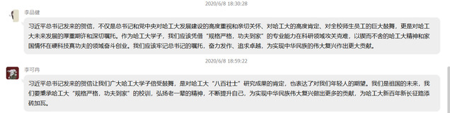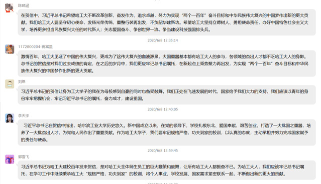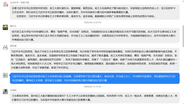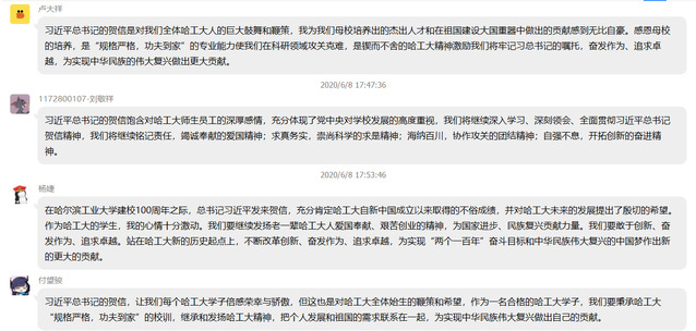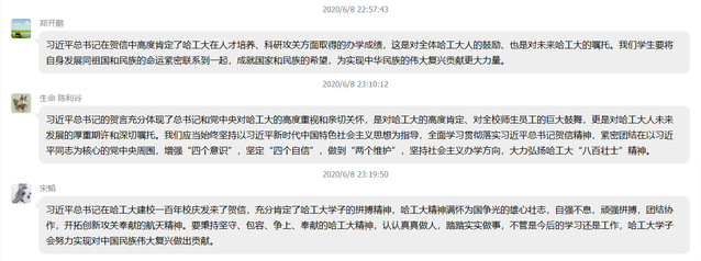 2020年6月7日为哈工大建校百年纪念日,习近平总书记致信庆贺必赢net.95建校一百周年,向全校师生员工和校友致以热烈的祝贺和诚挚的问候。必赢net.9517级本科生共同学习了习近平总书记的贺信,倍感振奋,深受鼓舞,纷纷畅谈学习体会并发表在年级群中。