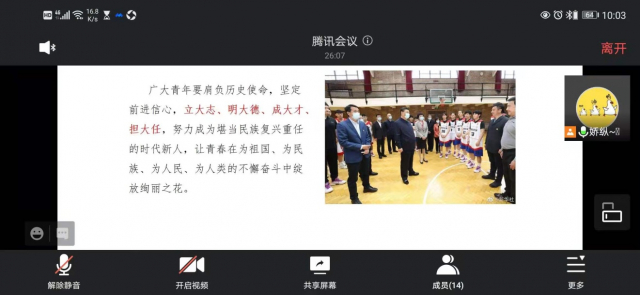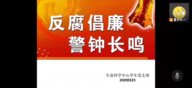 2021年5月23日生命中心学生党支部党员同志集体在线深入学习贯彻习近平总书记在清华大学考察时重要讲话精神和进行反腐倡廉学习。